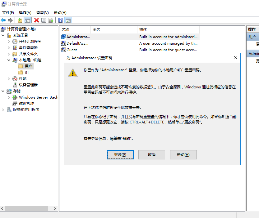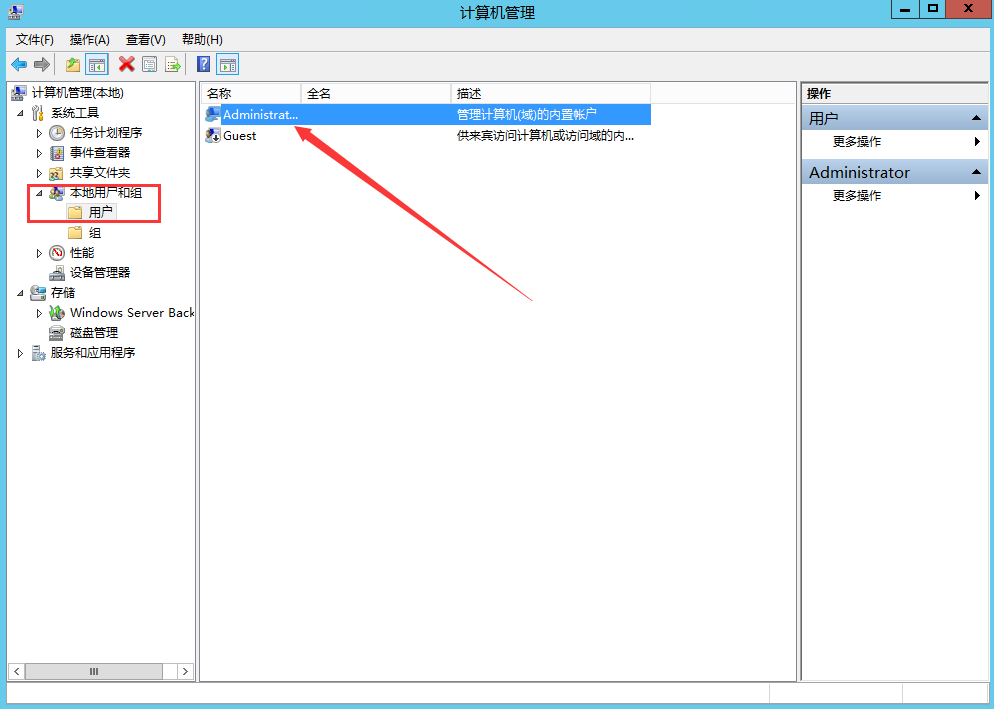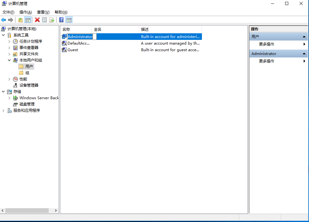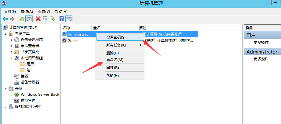 4、单击Administrator,右键能看到“设置密码”和“重命名”操作