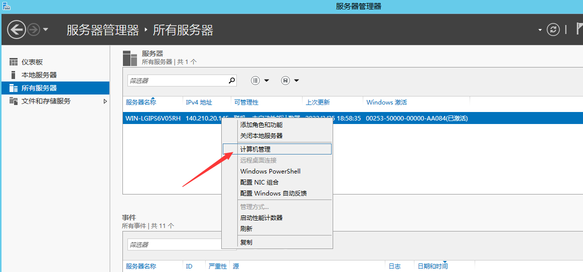 2、打开服务器管理器后,点击“所有服务器”,可以看到你的服务器,单击服务器右键“计算机管理”